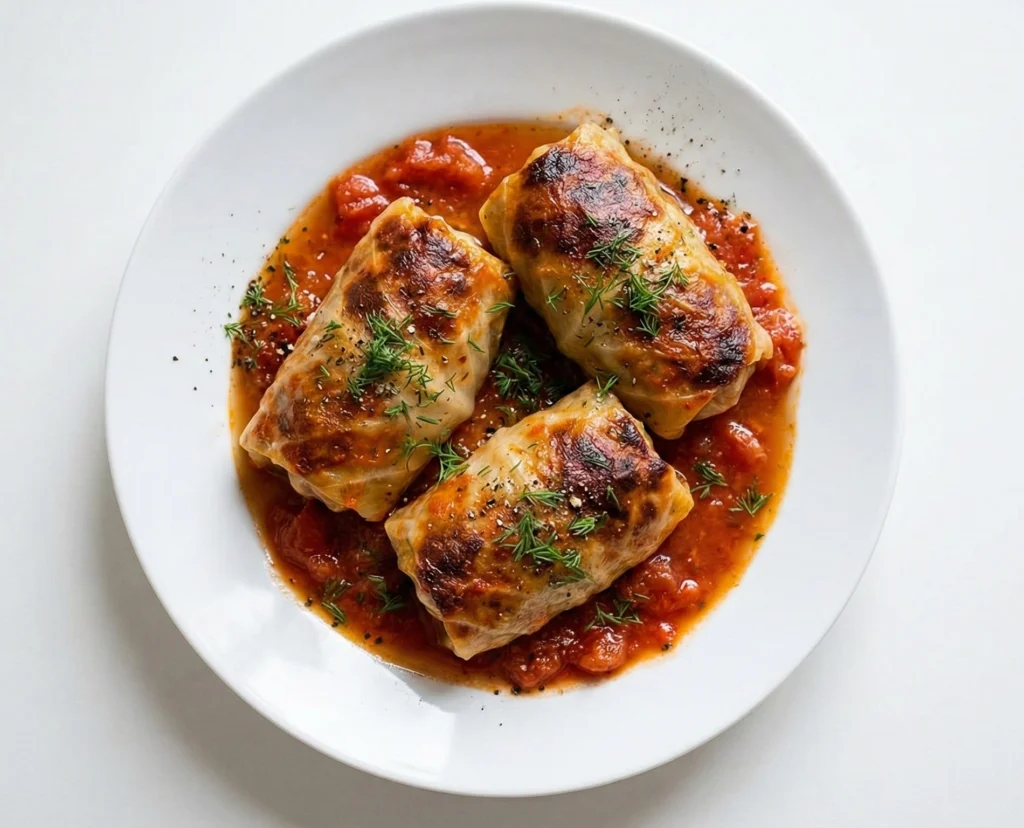 - Pieczenie: Przełożyć do naczynia żaroodpornego, zalać sosem i piec w temperaturze ok. 180°C przez około 30–45 minut, aż gołąbki będą dobrze podgrzane.
